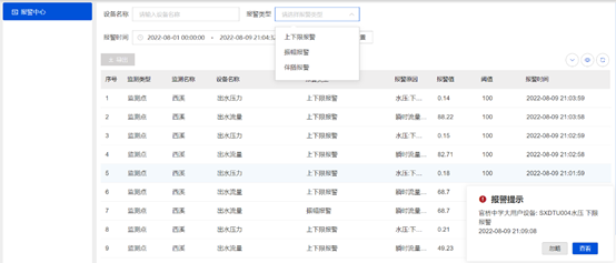 SCADA系统为客户提供多种灵活的报警配置,包含限值报警、振幅报警、伴随报警,客户可根据不同的场景选择不同的报警配置,同时系统还会通过弹窗、图标变红、语音提醒多种方式及时提醒调度人员异常情况,为客户做到报警全方位,配置多元化,从而达到降低漏损的目的。