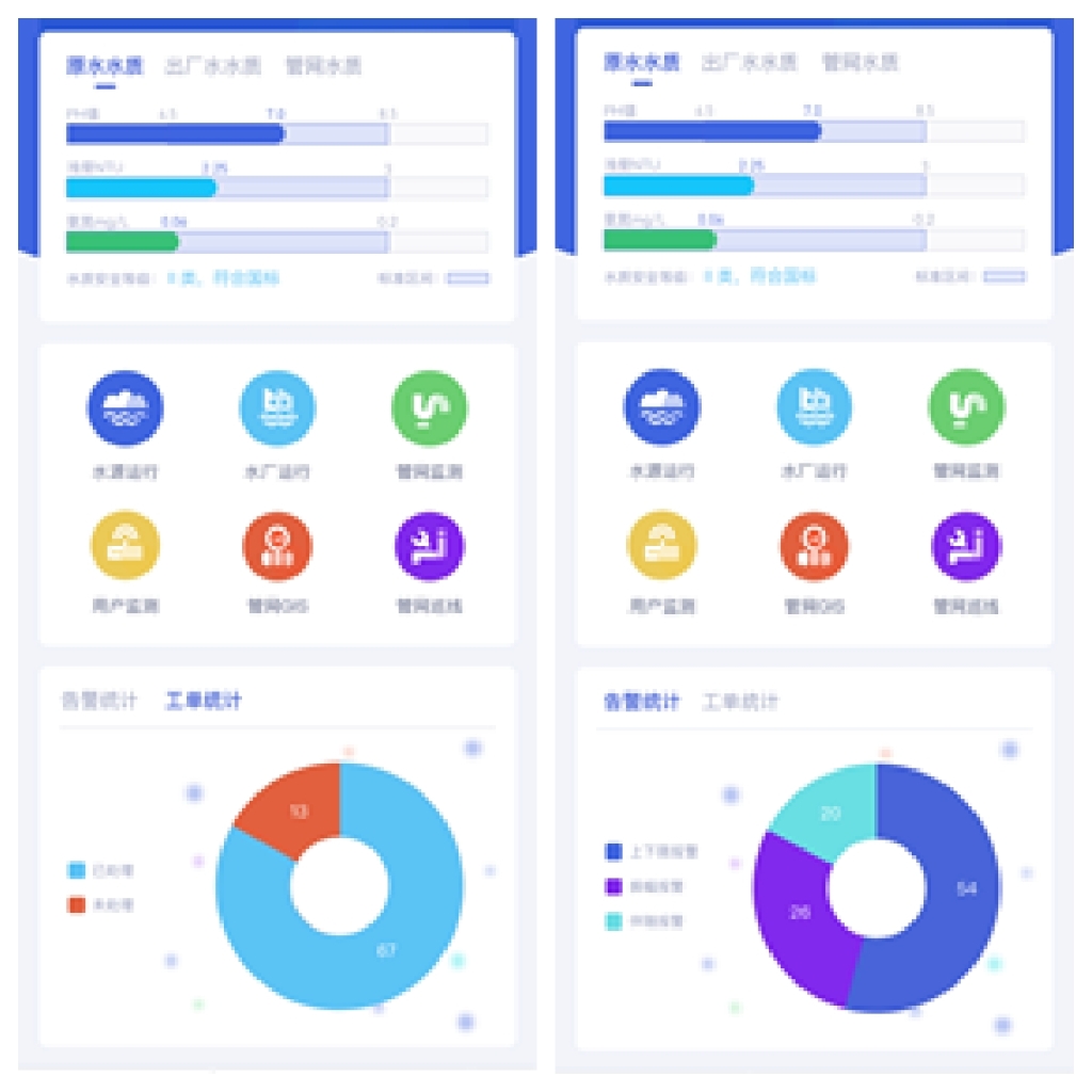 供水APP集生产调度、管网地理信息、管网巡检、营销客服管理等平台端系统的大部分功能,可随时调取生产、调度、客服等各环节的详细数据,实现从水源到水龙头全流程关键阶段移动化管理。