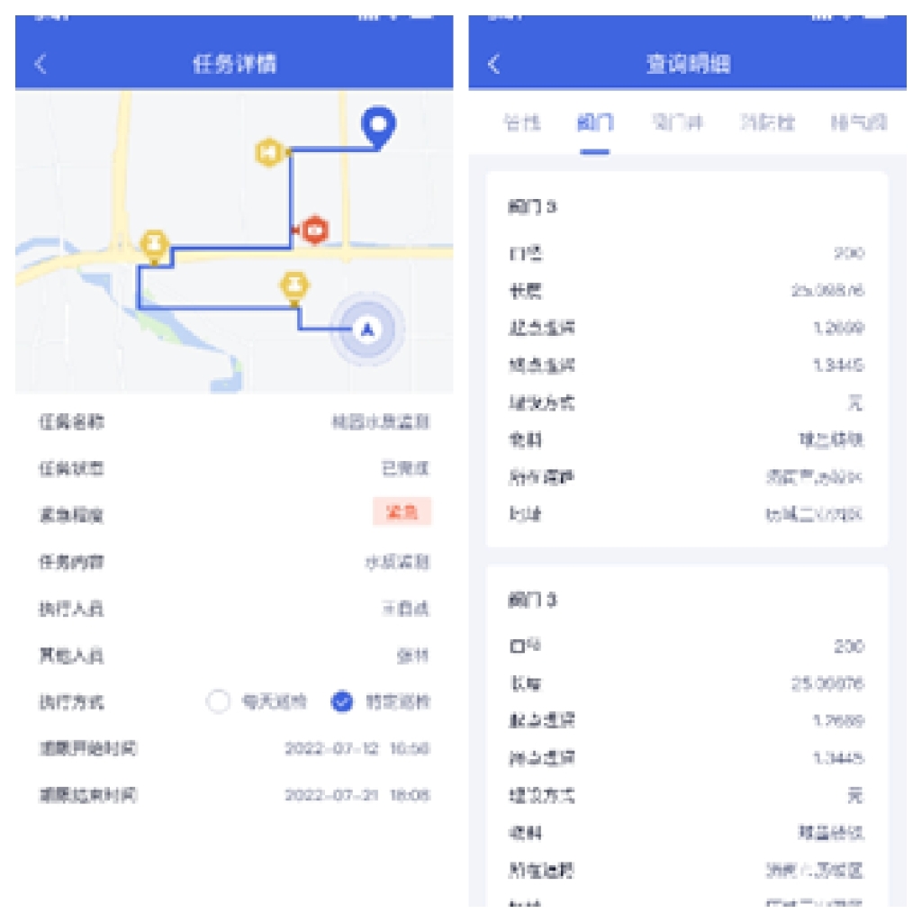 通过GIS技术在移动端的应用,供水APP能在巡检路线上显示系统中已经录入的设备,点击设备图标可显示设备的基本信息及未处理完成的缺陷工单和维修工单等,巡检人员依据在移动端接收到的巡检计划,通过任务获取、巡检提示、移动端动态记录与实时反馈等功能,极大地提高了设备的巡检效率,确保了设备的完好率、准确率,同时巡检人员能实时掌握管线走向、材质、口径、维修等数据,克服了原先由于管线资料不全、部分区域存在巡检盲区的不足,提升了查找漏点的准确率。供水APP实现了区域、位置、设备等模型与数字化信息的实时互动,提高了巡检人员执行任务的工作效率。