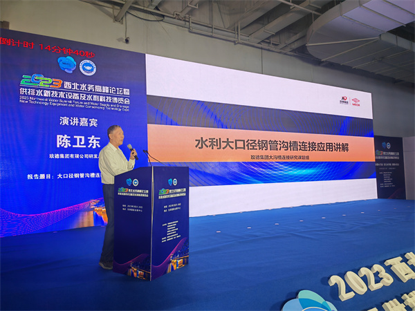 在论坛上,玫德集团研发技术总工程师陈卫东以“水利大口径钢管沟槽连接应用技术”为题进行主题演讲。
