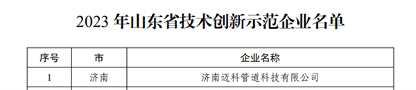 2023年11月6日,山东省工信厅网站公布了《山东省工业和信息化厅关于公布2023年山东省技术创新示范企业的通知》。经企业自愿申报、有关单位推荐、专家论证和公示等程序,认定济南迈科管道科技有限公司等107家企业为2023年山东省技术创新示范企业,名单现予公布。