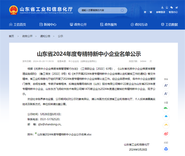 2024年5月28日山东省工业和信息化厅发布《山东省2024年度专精特新中小企业名单公示》通知,玫德集团旗下济南迈克阀门科技有限公司、山东晨晖电子科技有限公司、临沂玫德庚辰金属材料有限公司、玫德集团临沂有限公司顺利通过2024年度山东省“专精特新”中小企业复核,玫德集团旗下信通科技(山东)有限公司首次通过2024年度山东省“专精特新”中小企业认定。