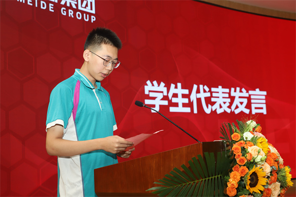 平阴一中张淼、实验高中赵崟诗、工业学校郭芳毅和玫德集团员工子女贾明硕分别作为学生代表发言,他们衷心感谢玫德集团对平阴教育及其个人的支持,助学金不仅是经济援助,更是精神动力,他们将勇于追梦,不负期望,以实际行动回馈社会,书写青春华章。
