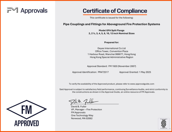 Meide Group's GFA Grooved Flange Fittings in sizes 2, 2 ½, 3, 4, 5, 8, 10, and 12 are FM approved